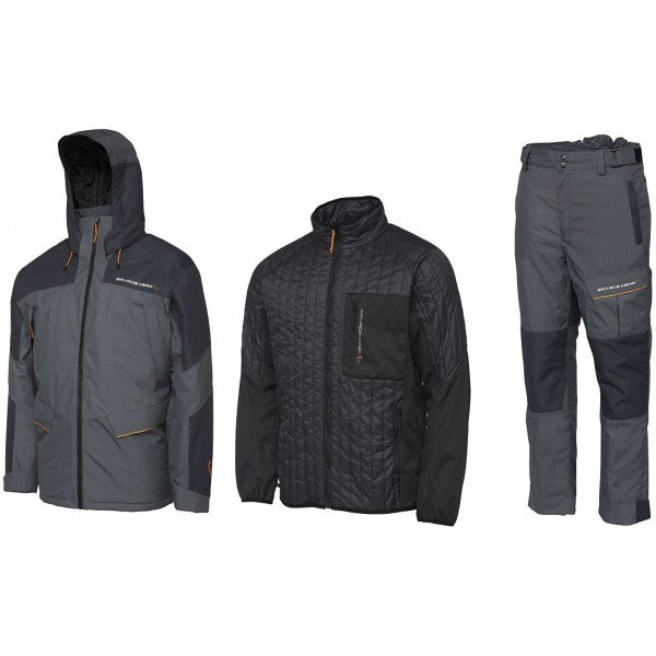 Šis trijų dalių Savage Gear kostiumas yra maksimaliai funkcionalus, 100% atsparus vandeniui, pralaidus orui ir yra itin patogus. Atsparumą vandeniui užtikrina 8000 mm TPU membrana, o kvėpavimą 800 mvp mebrana, išorinė medžiaga iš patvaraus poliesterio, šilumos izoliacija su 160 g/m² pūkų tipo poliesterio paminkštinimu kostiume ir 80 g/m² rankovėse, kelnės ir vidinė striukė, šiltas pamušalas iš 140 gsm poliesterio. Pašildytos kišenės rankoms apšilti. Nuimamas ir reguliuojamas gobtuvas ir reguliuojamas juosmuo. Dvi priekinės kišenės su užtrauktuku ir didelė šlaunies kišenė. Sustiprinta medžiaga ties nugara ir keliai. Ilgi užtrauktukai ant kojų su įsegimu ir reguliuojamu Velcro užsegimu. Neperpučiama, dygsniuota vidinė striukė. 3 kišenės su užtrauktuku.