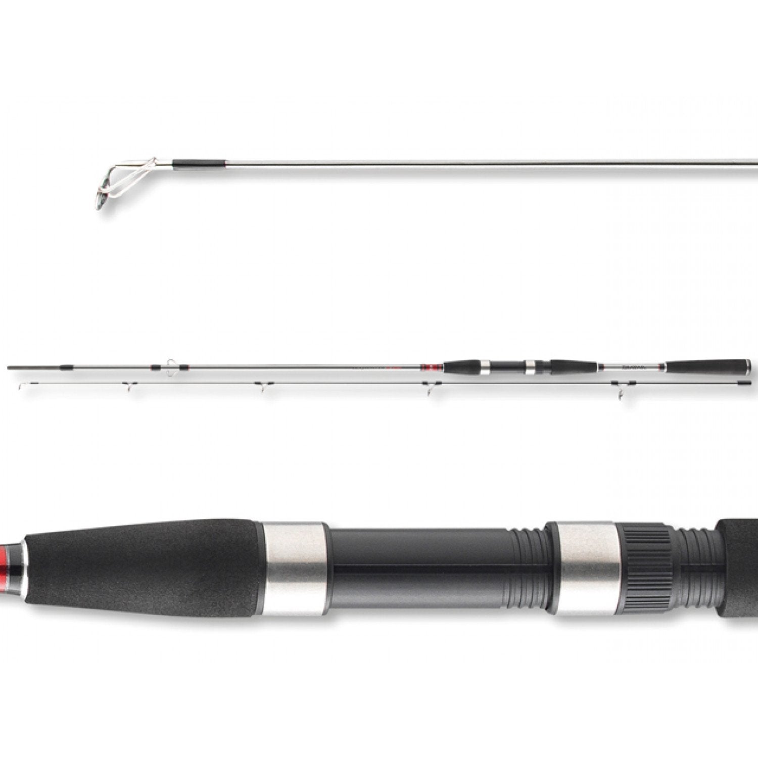 Jūros vandeniui atsparūs titano oksido dvikojai žiedai lengvai atlaiko nuolatines pinto valo apkrovas. Maloni dviejų dalių meškerė su EVA rankena.